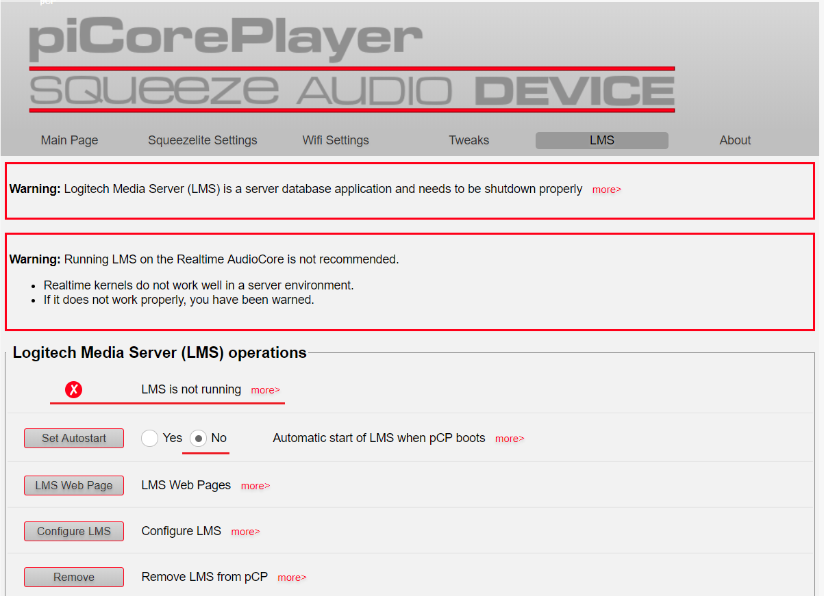 因為是當 Player 端,所以把 LMS 也關了吧。Autostart 設 NO,下次開機就不會開啟 LMS。